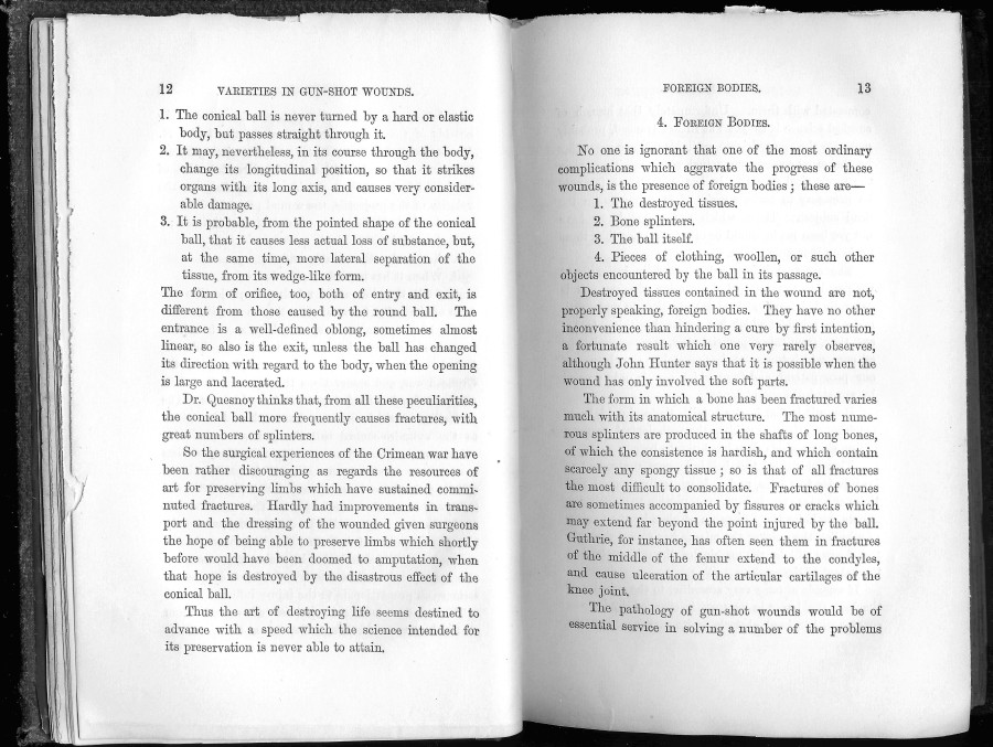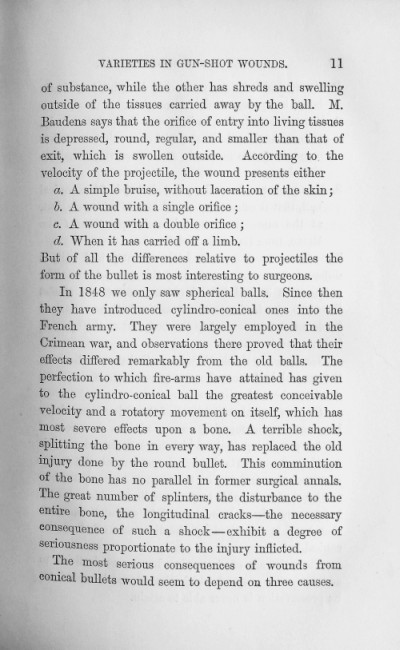 Civil War Bullets, Forceps, And Extractors Although over 1000 different bullet types were used in the civil war the standard muzzleload projectile was the 3 ring lead 58 caliber Minie. First invented by Claude Etienne Minie it saw early limited use in the Crimean War. A test of this new technology in Vincennes in 1849 demonstrated that at 15 yards the bullet could penetrate two boards of poplar wood, each 2/3 inch thick. After further testing and refinement it was ultimately adopted as the standard bullet in 58 caliber size for the United States military Springfield rifle and later widespread use in the civil war. The picture below of Minie ball design is from Harpers Ferry: There were many variations but the key features included the creation of grease packed grooves( which expanded under intense heat and pressure from the powder charge) and a hollow conical base with a thin rim to hold and trap the powder charge. The projectile was made of soft lead with a hollow conocal base to trap expanding gas and allow for expansion. When fired, the expanding gas pushed forcibly on the base of the bullet, deforming it to engage the rifling in the barrel. This provided spin for accuracy, a better seal for consistent velocity, longer range, and cleaning of barrel debri. The high velocity and increased range from bullet spin resulted in severe wounds which shattered rather than just fractured bone. The severely comminuted fractures resulted in the need for amputation otherwise tissue infection, osteomeyolitis, sepsis, and ultimately death would follow. The fact that bullet velocity is directly porportional to tissue injury was not well understood at the begining of the civil war. Infact, early speculation was just the opposite(see below). However, the high increase in tissue damage and bony distruction of the new conical bullets was well known by early military surgeons who witnessed its deadly effects in the Crimean War. The excerpts below are from The Ambulance Surgeon or Practical Observations on gunshot wounds by Louis Appia 1862. Lacking the modern assistance of xray technology civil war surgeons had no certain way to tell bullet track and fragment dispersal. It was generally considered best to remove the bullet for fear of poisoning by the foreign material. The only practical way avaliable to them was direct wound exploration via incision or probing with various instruments specifically designed for this purpose. BULLET PROBES Bullet probes were generally metallic with a long thin shape. Some had small openings to facilitate placement of gauze or medicine into the bullet track. The Nelaton type had a round porclean tip designed to help locate the bullet deep inside tissue. By inserting the probe and rubbing it against the bullet, the soft lead would leave telltail marks on the porclean. This mark would differentiate it from bone which would not leave a gray mark on the porcelain after rubbing. There were variations which included a flexabile shaft to traverse curved or angled bullet tracks. BULLET EXTRACTORS Extractors were specially designed to remove the bullet, bullet fragments, or other foreign material from the wound.They were also, by nature of intent, long thin metal instruments. In there most simplistic form they had a long metal shaft with a screw tip. The screw was driven into the soft lead bullet and then removed. There were also similar forms with a scoop tip rather than screw. They were usually heavy built to exert maximum force at there tip to hold and remove the bullet. Common types were the Gross, US Army, Tiemann, and Thomasin's. Other more complex designs such as Mose's, Weisse's and Collins were used.